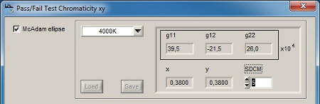 g11, g12 and g22 are the individual coefficients for each ellipse, Δx and Δy are the deviations from the rated values x and y and SDCM means standard deviation of color matching (tolerance factor or McAdam Color steps). So the ellipses are defined in position, orientation and size.