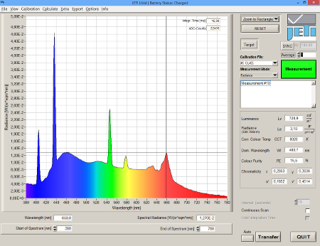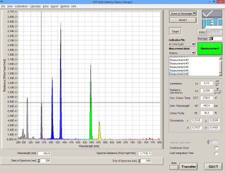 Each luminescence material has its characteristic spectrum. Different materials will be mixed according to special receptures to achieve desired chromaticities and color temperatures of fluorescent lamps. It is necessary for quality control to monitor these data and the prefered method is to measure the spectra by a spectroradiometer and calculate the values.