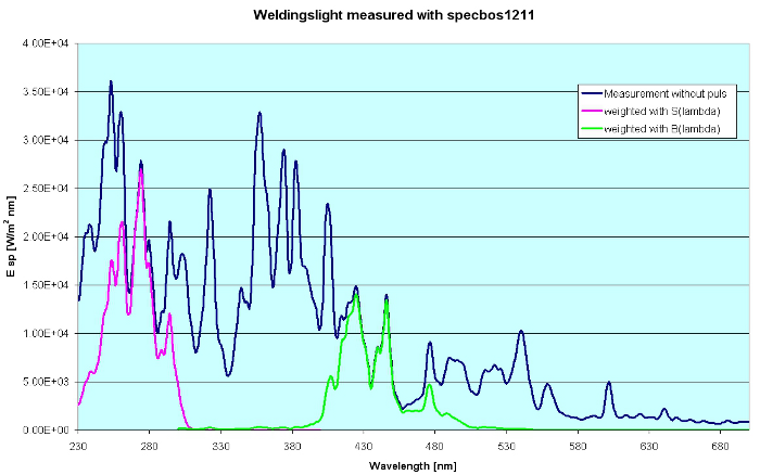 The Radiance based measurements must be done with a direct viewing optics (small viewing angle, radiance mode), the irradiance ones with an optics viewing in the half space (viewing angle 180° = 2π, measurement with diffusor or integrating sphere, irradiance mode). The exposure result will be obtained by integration of the weighted spectrum and multiplication by the exposure time (presumed that the intensity of the radiation is constant during the exposure).