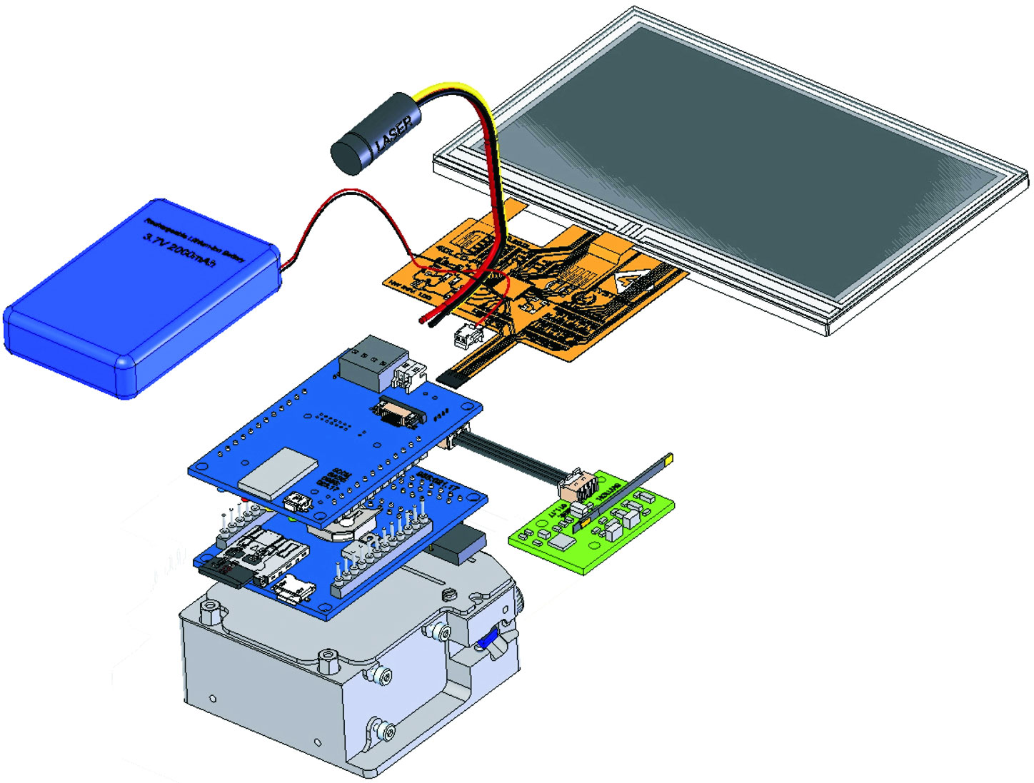 The figure above shows a complete RU40/90 system with all possible peripherical elements as piezo shutter, a display, a laser diode and a Li polymer battery. Bluetooth or alternatively LAN interfaces are on board. This system can be used for the simple and fast development of a portable or stationary device.